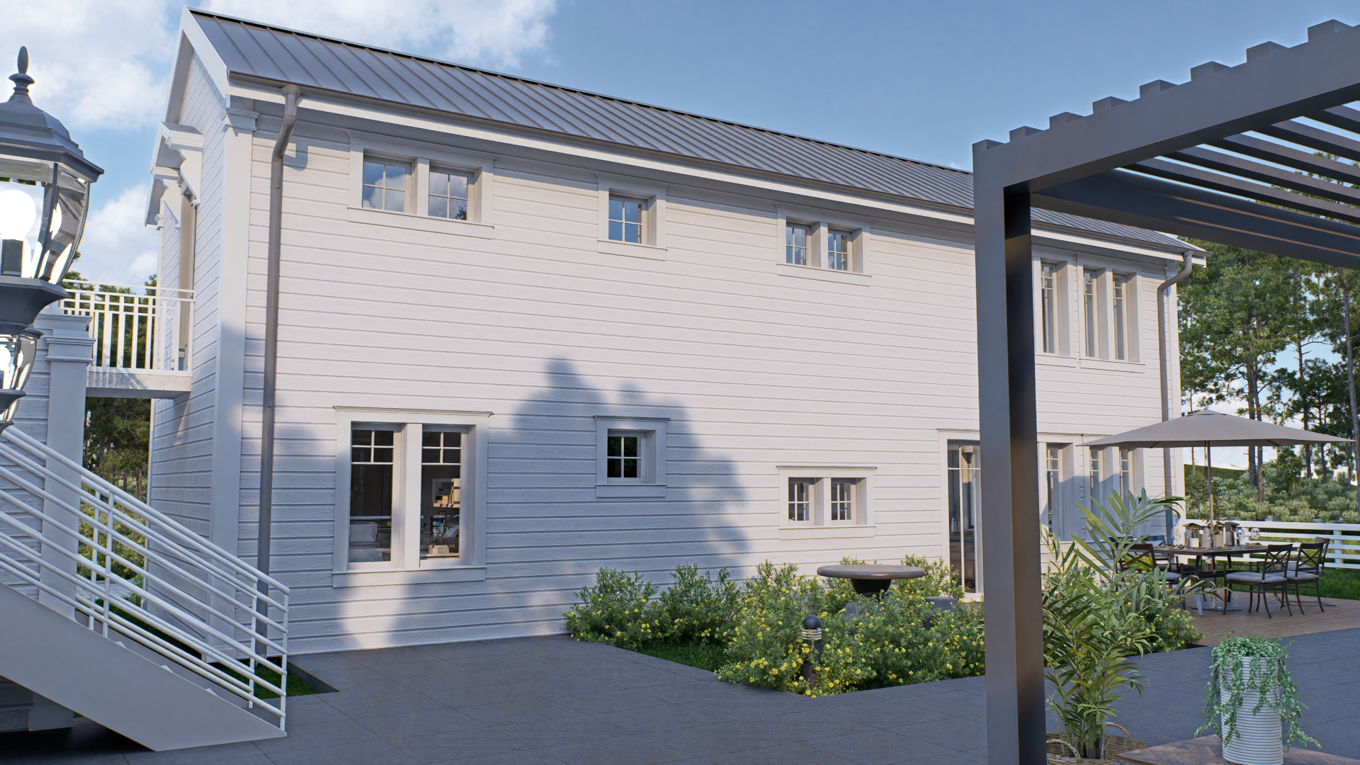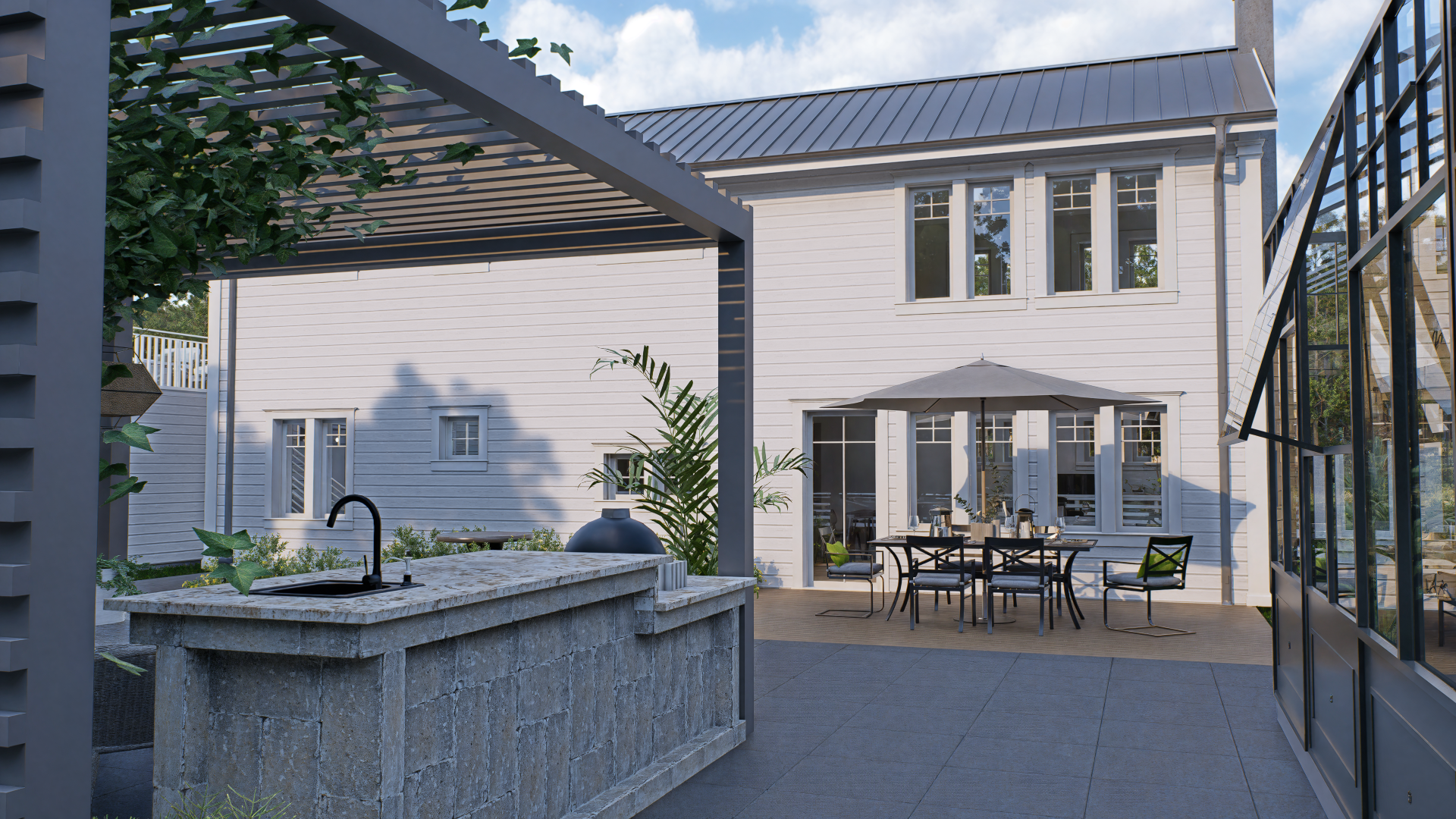 Extra byggnad med förråd och plats för arbetsrum, bastu eller gästrum. Gärna med takterass över till garage